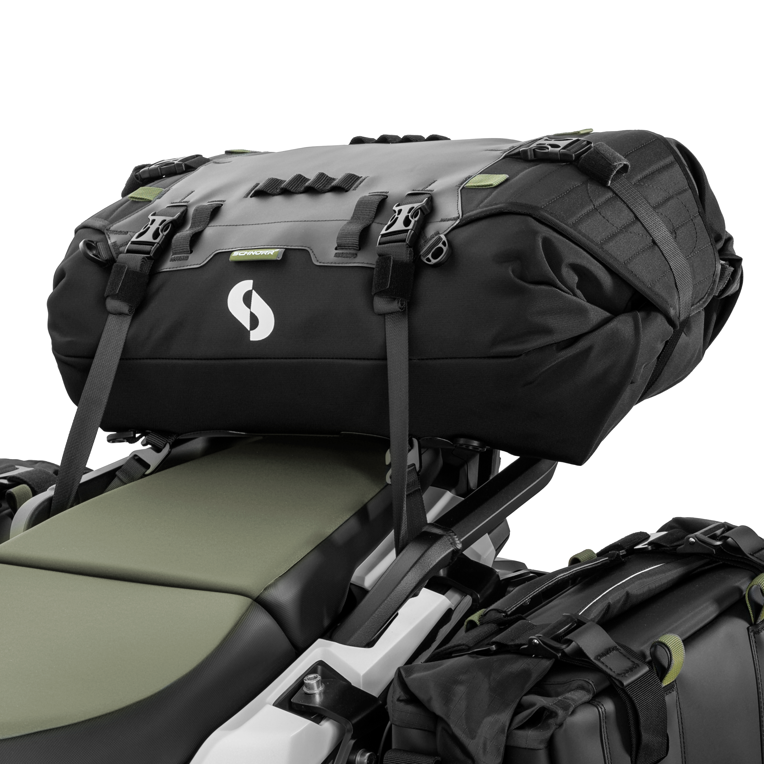 Der Rollverschluss sorgt für schnellen Zugriff und sicheren Nässeschutz. Vier stabile Gurte halten die Tasche fest auf dem Motorrad, seitliche Tragegriffe erleichtern das Handling abseits des Bikes.